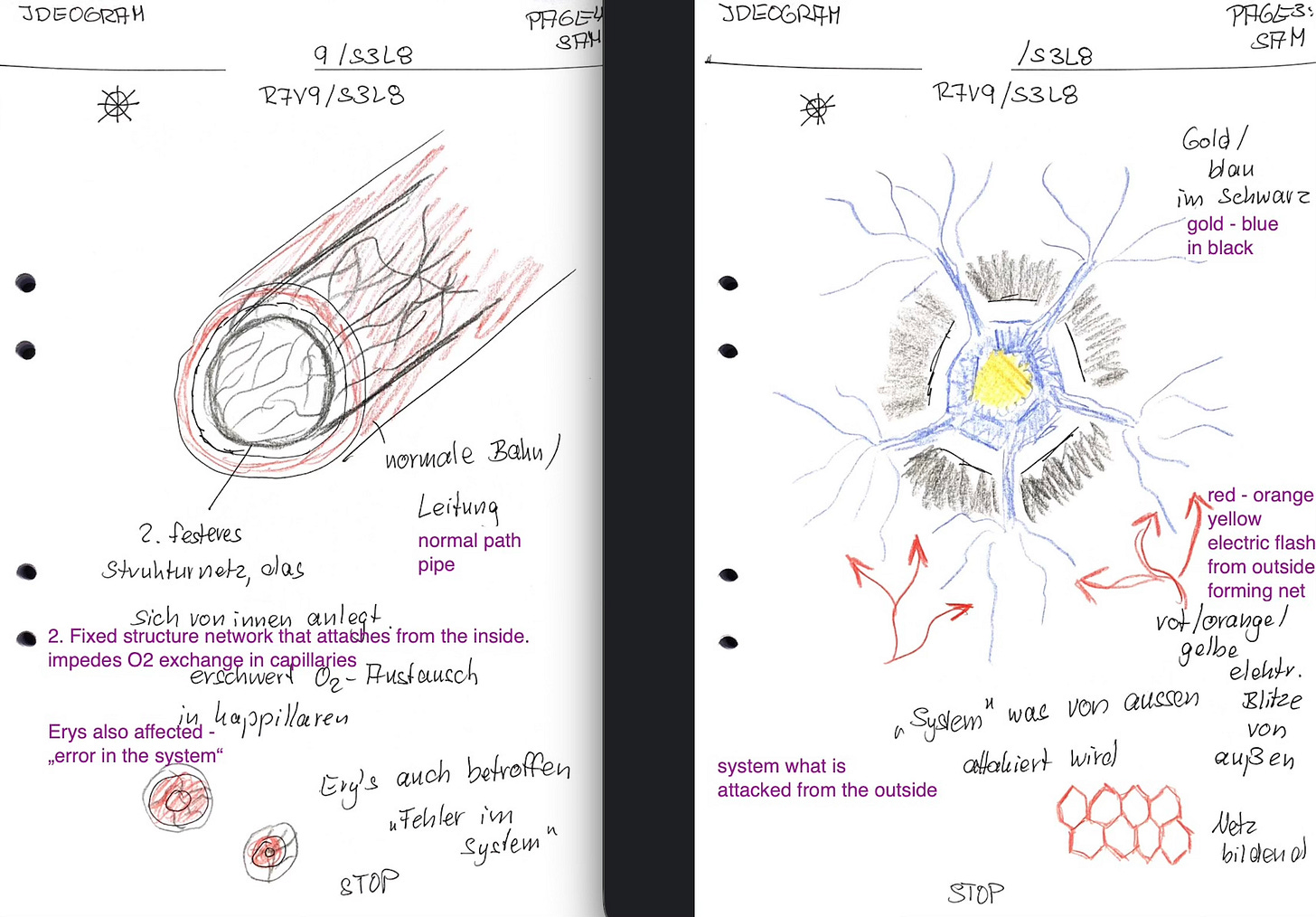 From my first remote viewing session in April 2023 on this topic, there are already many indications of the network building up in the body, as well as the problems we can now see everywhere with the RBCs: