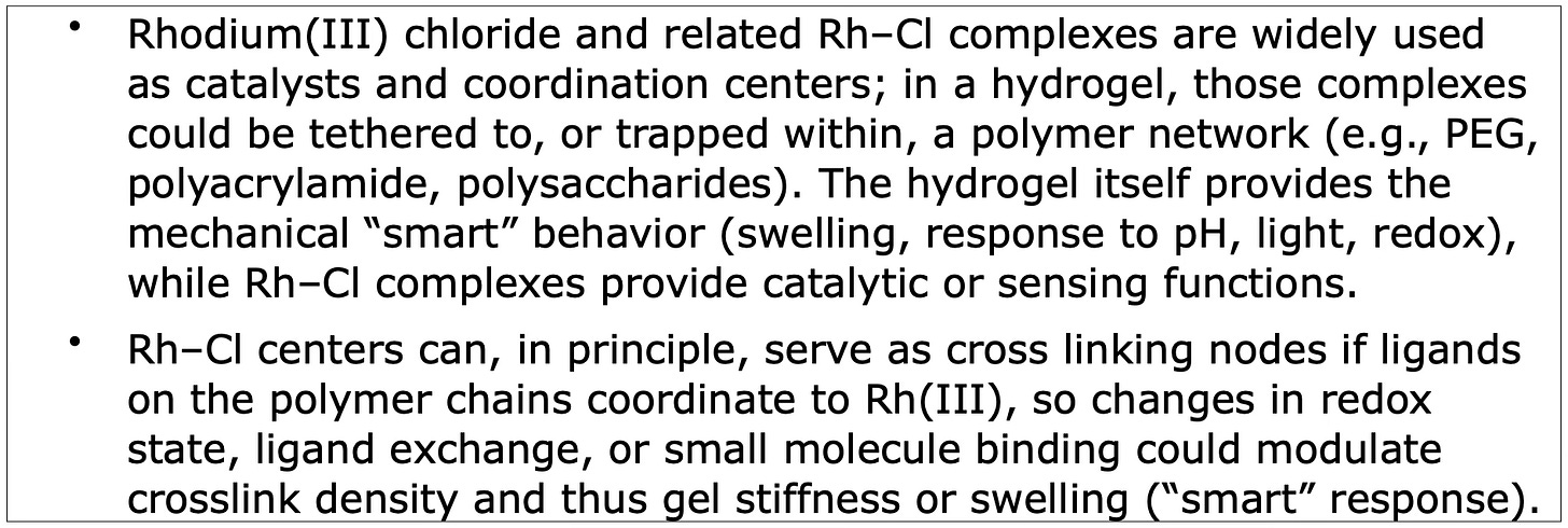 It can therefore be assumed that an electrolyte is built from rhodium and chloride. The color of the hydrogel changes from yellow to reddish brown in the presence of rhodium when it oxidizes and confirms this via the optics!!! We know these color accumulations well enough!!!