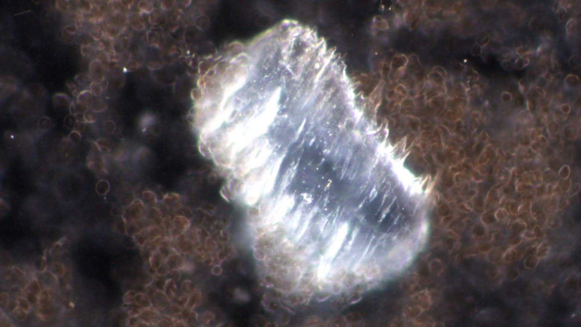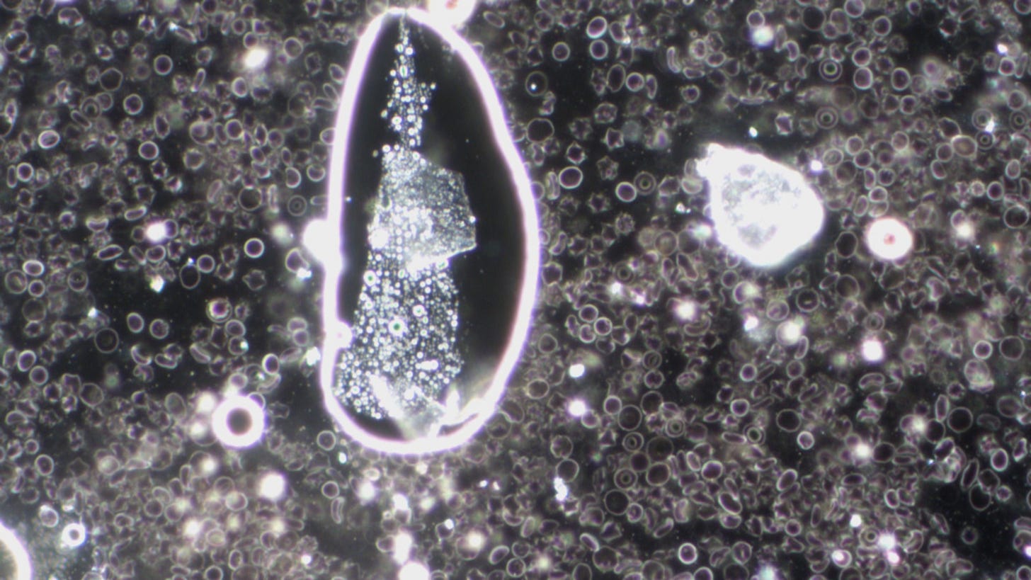 In the following blood picture, there are hardly any blood cells left; everything has been broken down. However, a permanent construction phase of various structures can still be seen here, such as these elongated rod-shaped parts, which are always close together. They do not move themselves. What is interesting here is that all colors show metallic reflections.
